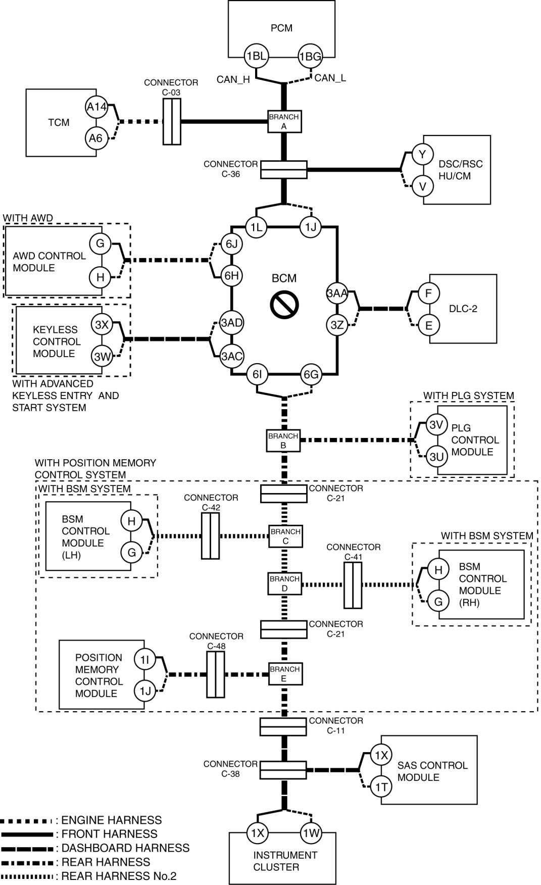 - Wiring harness between keyless control module terminal 3W and BCM terminal 3AC