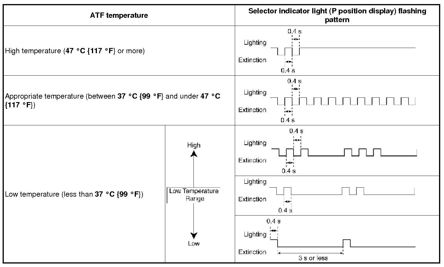 - If the flashing of each light cannot be verified as according to the procedure while switching to the ATF temperature display mode, the switching procedure has failed. Repeat the procedure from the beginning.