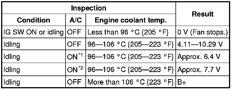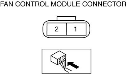 4. Measure the voltage at terminal 2 of the fan control module connector (2 terminals) as shown in the table.