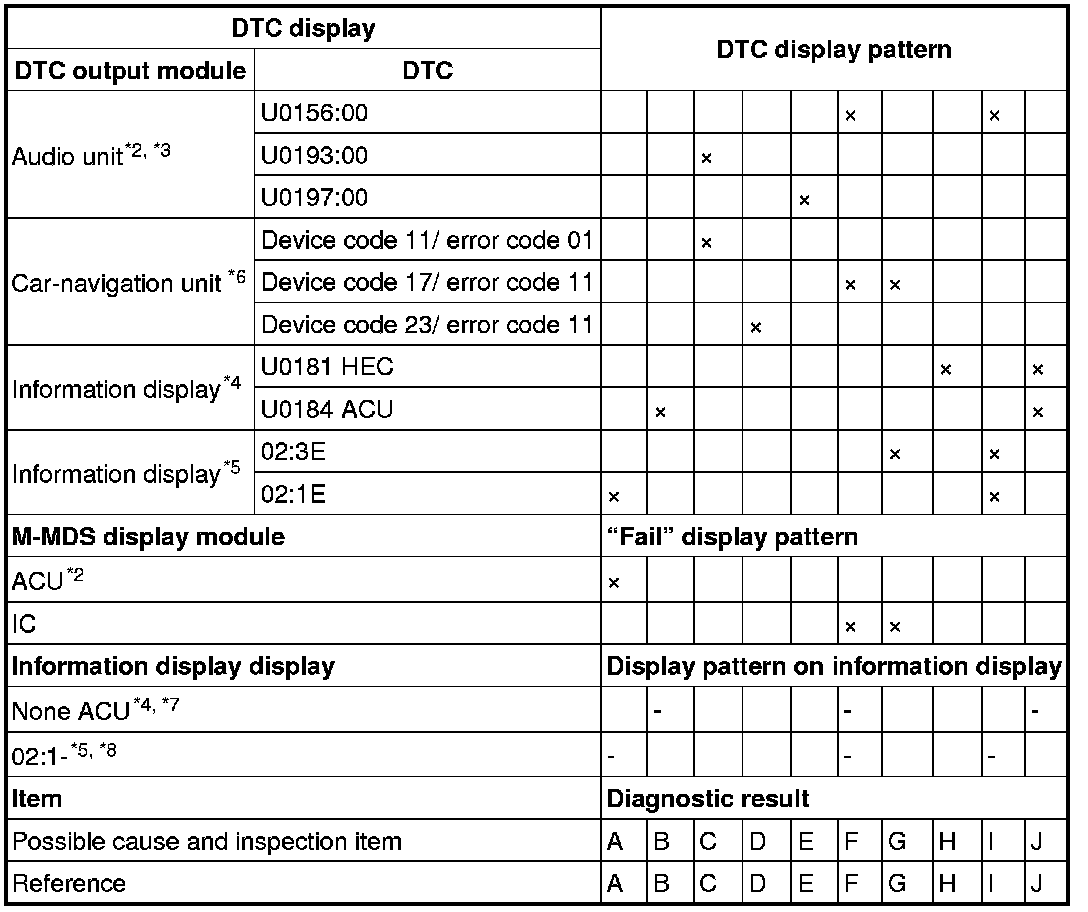 - A hyphen(-) in the DTC output pattern cell indicates that the DTC may be displayed depending on the malfunction detection conditions. If it is not displayed, the malfunctioning part can be determined by checking only the crosses (x).