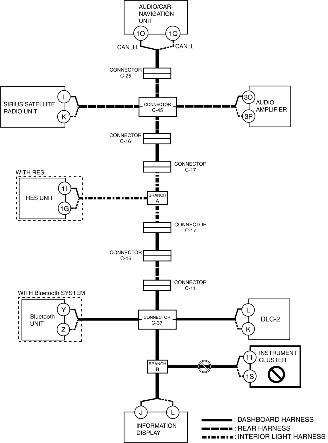 - Open circuit in wiring harness between audio/car-navigation unit and connector C-25