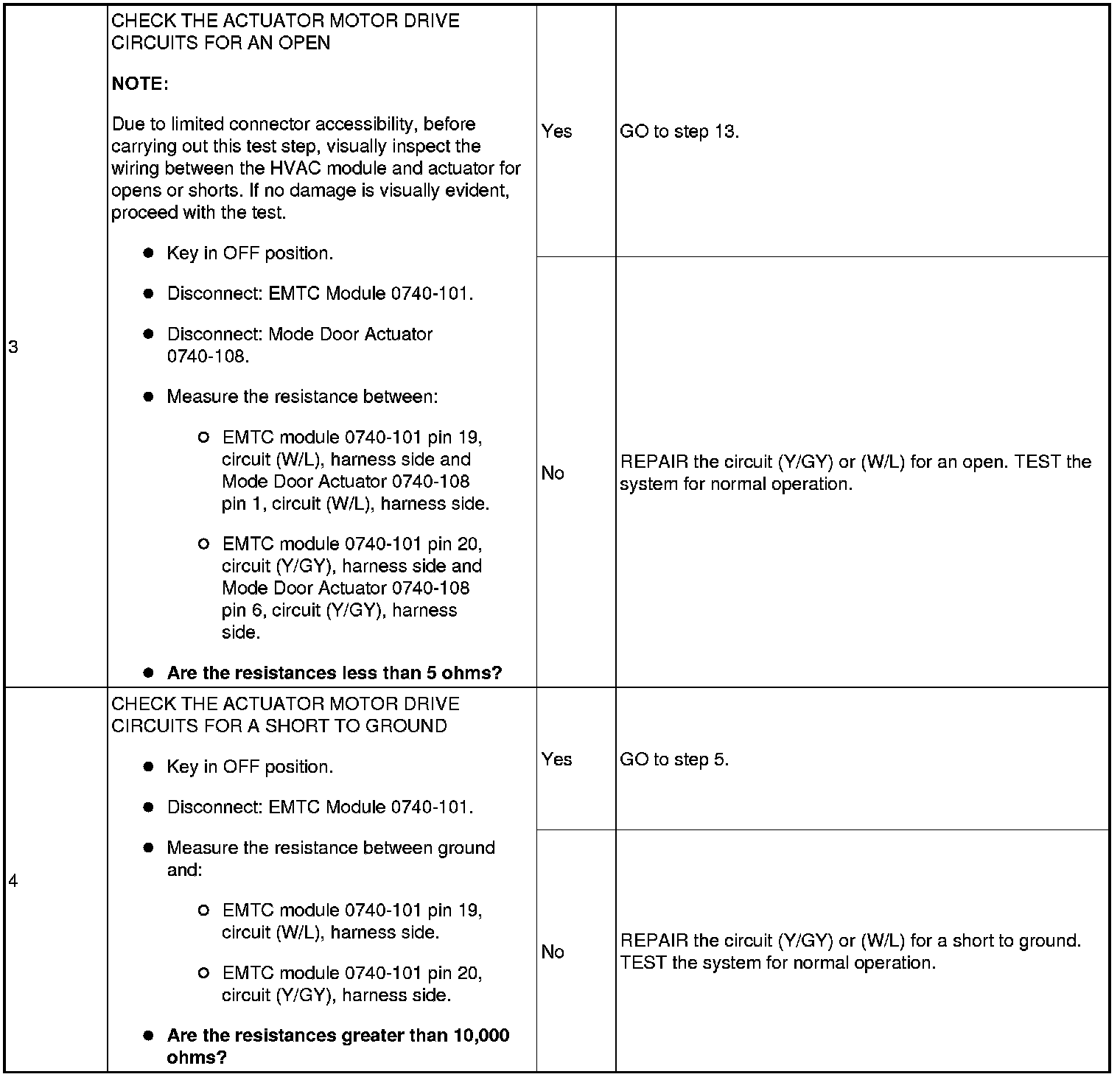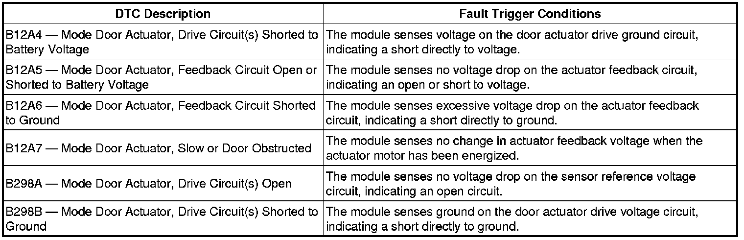 To rotate the mode door actuator clockwise, the electronic manual temperature control (EMTC) module supplies voltage to the FLOOR/DEFROST/PANEL mode door actuator motor through circuit (Y/GY), and supplies ground through circuit (W/L). To rotate the mode door actuator counterclockwise, the EMTC module reverses the voltage and ground circuits.The mode door actuator feedback resistor is supplied a ground from the EMTC module through circuit (GY/L) and a 5-volt reference voltage on circuit (BR/W). The EMTC module reads the voltage on the mode door actuator feedback circuit (Y/V) to determine the mode door actuator position by the position of the actuator feedback resistor wiper arm.