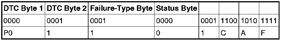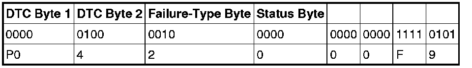 The failure-type byte is designed to describe the specific failure associated with the basic DTC. For example, an failure-type byte of 1C means circuit voltage out of range, 73 means actuator stuck closed. When combined with a basic component DTC, it allows one basic DTC to describe many types of failures.
