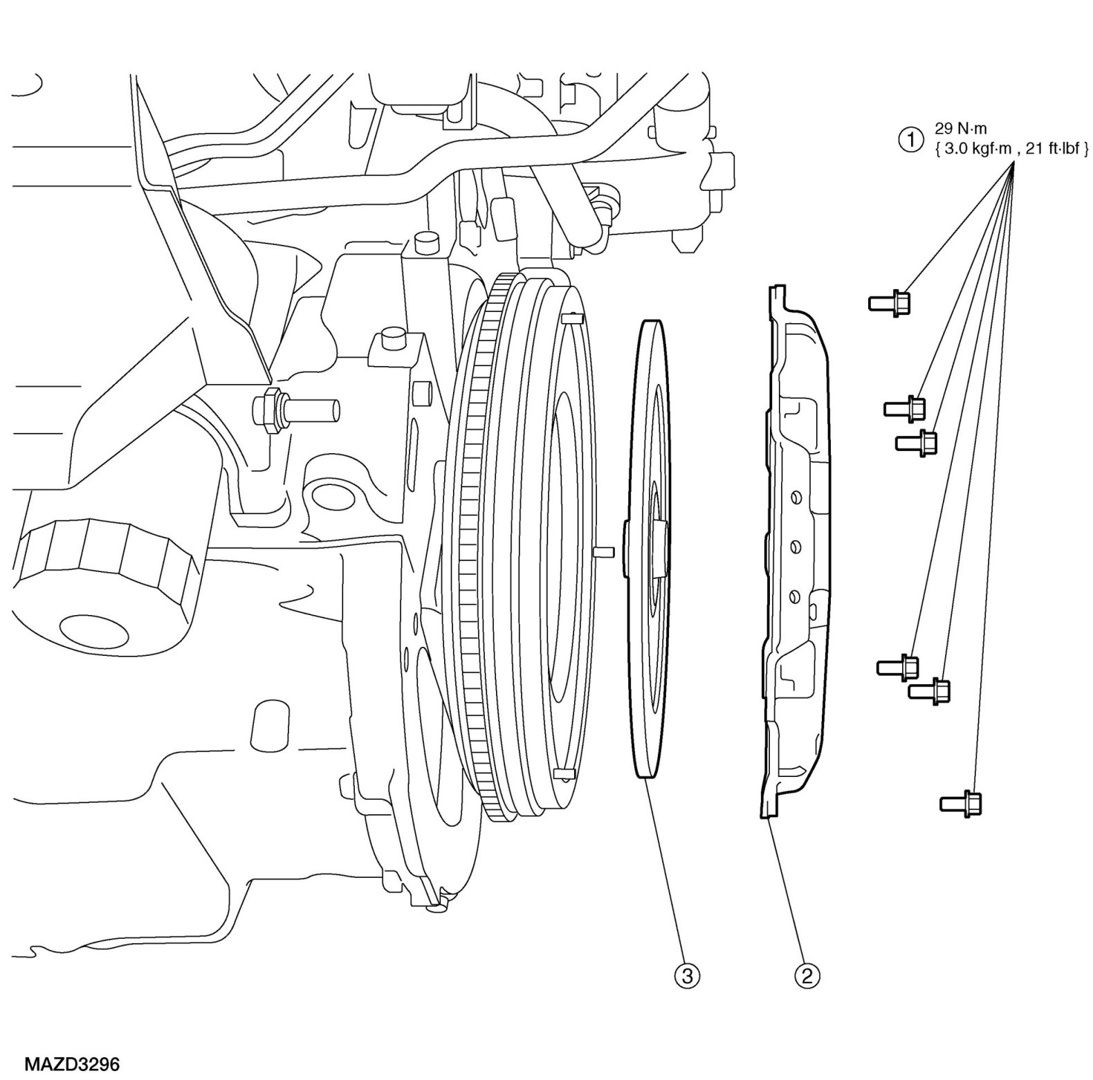 - Tighten to 29 Nm {2.9 kgf-m, 21 ft-lbf} in the sequence shown.
