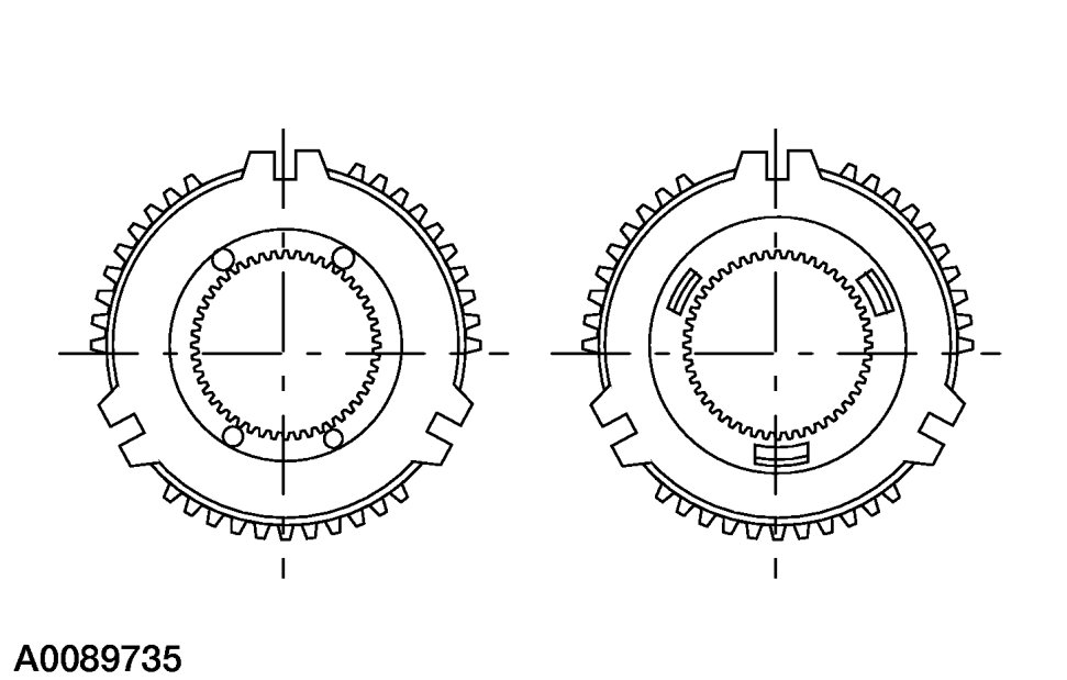 CAUTION:Make sure the synchronizer side with 3 notches is facing 1st gear and the synchronizer side with 4 notches is facing 2nd gear.