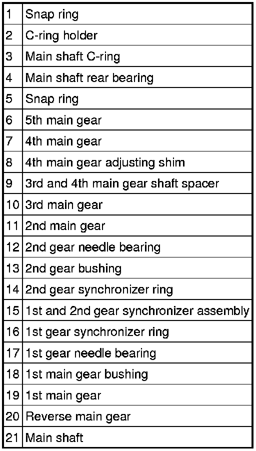 20. Measure the gap between the mainshaft C-ring and the mainshaft rear bearing. See the chart to select the appropriate C-ring thickness and install the C-ring.