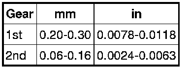 18. Measure the gap between the snap ring and the 5th main gear. The end play should be less than 0.1 mm (0.0039 in). See the chart to select the appropriate snap ring thickness and install a new snap ring.