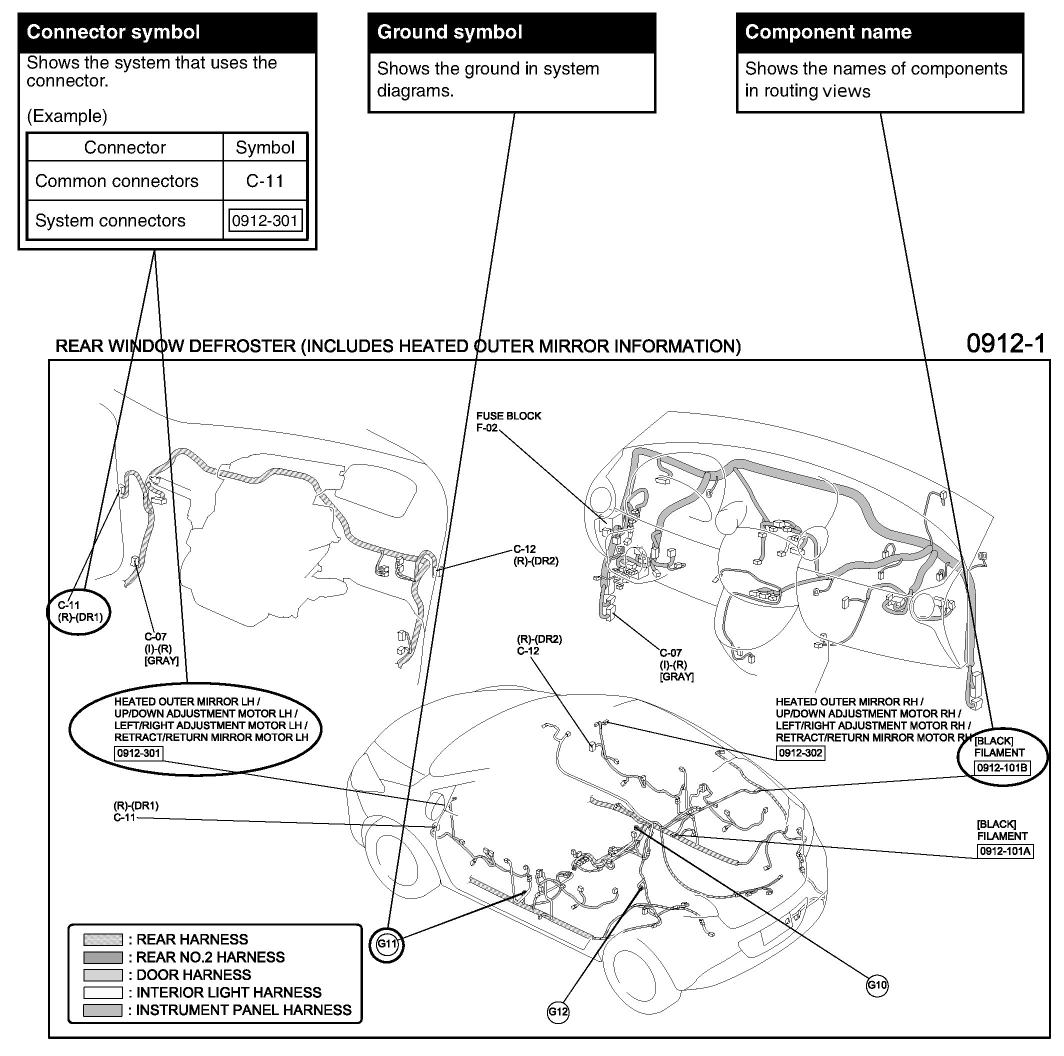 The routing view shows where electrical components are on the system circuit diagram by call out line and connector symbols.