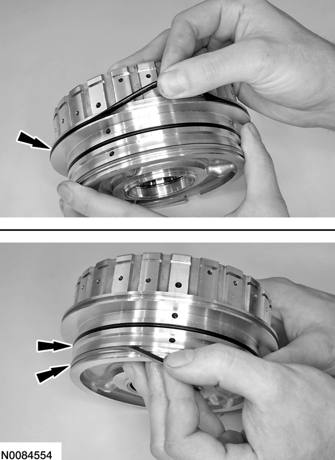 12. Install 2 new seals on the O/D (4, 5, 6) clutch piston and lubricate the seals with petroleum jelly.