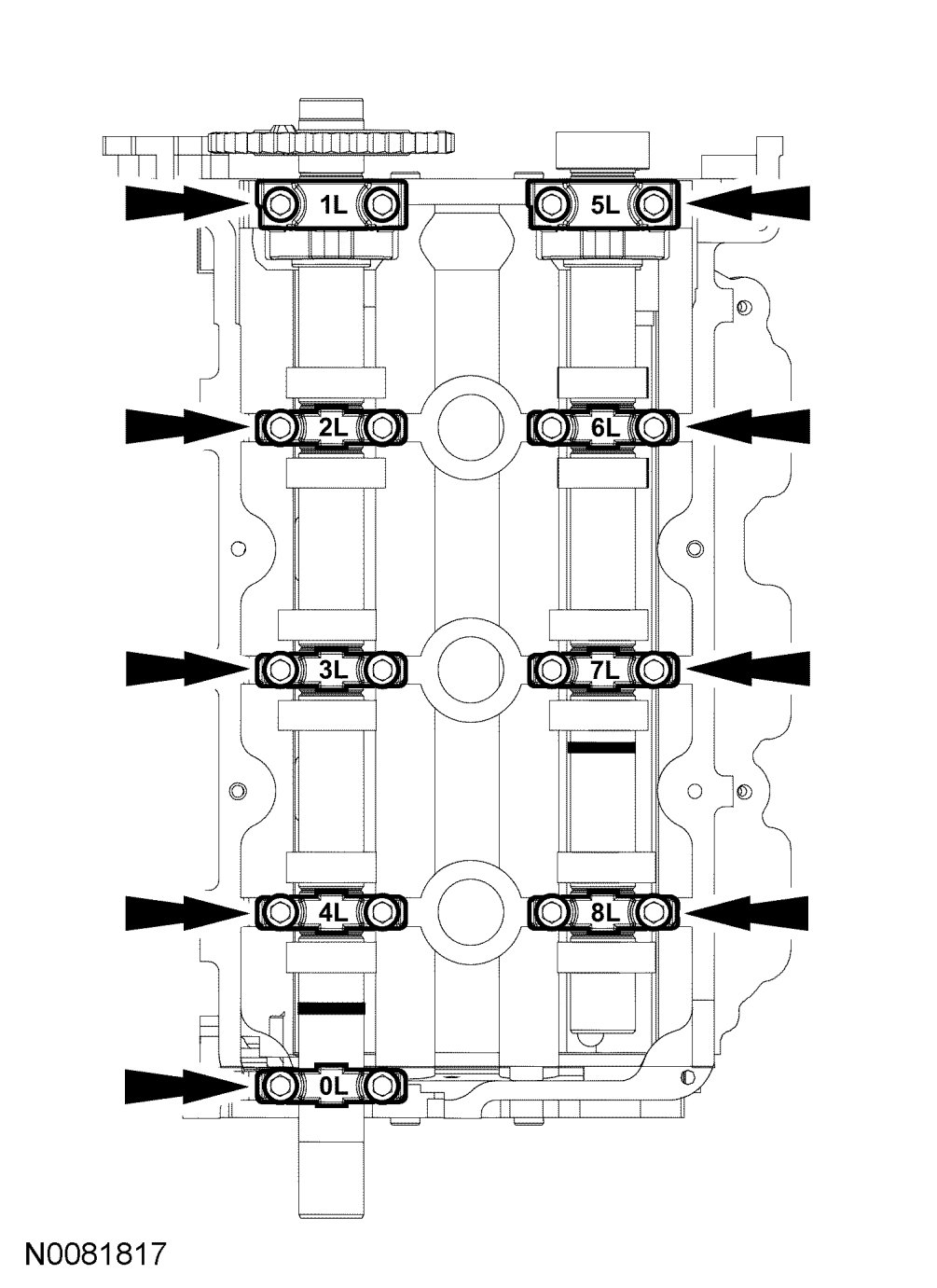 a. Remove the camshaft bearing thrust caps (1L and 5L).