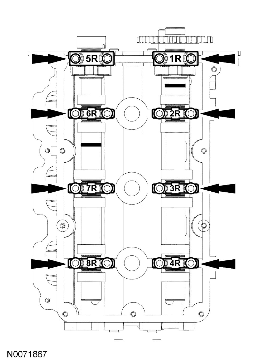 a. Remove the camshaft bearing thrust caps (5R and 1R).