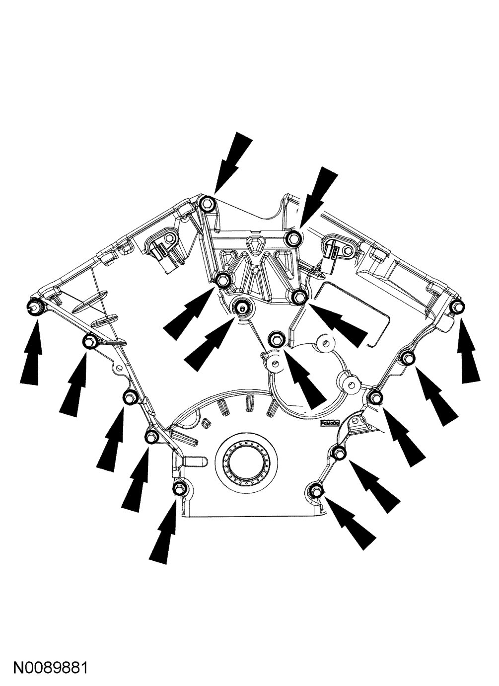 15. Remove the 5 coolant pump housing bolts.