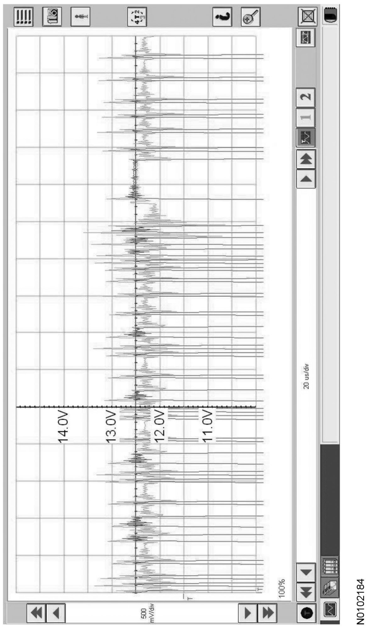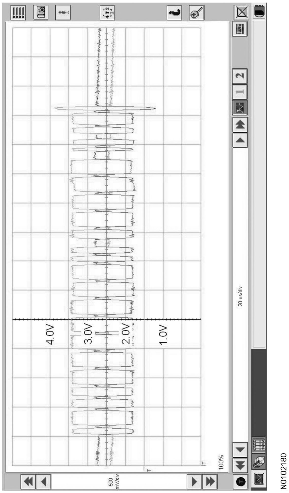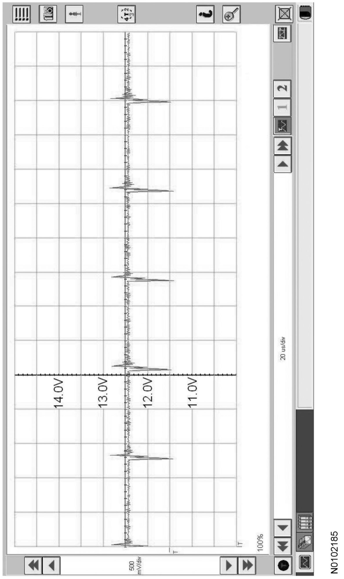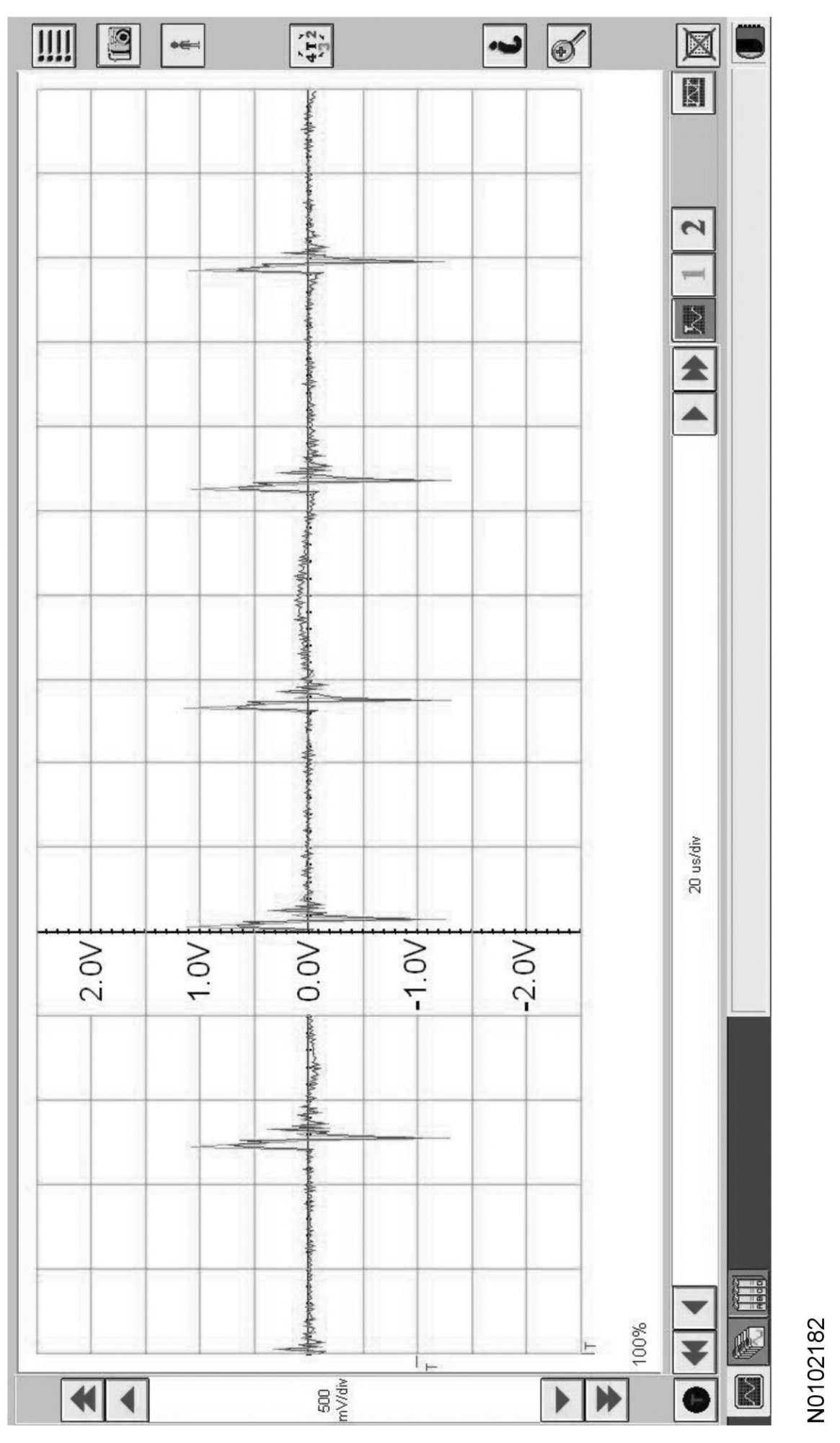 Traces below are viewed at 500mV per division (vertical axis) and 20 microseconds (20μs) per division (horizontal axis). Readings taken with a different oscilloscope vary from those shown. Compare any suspect readings to a known good vehicle.