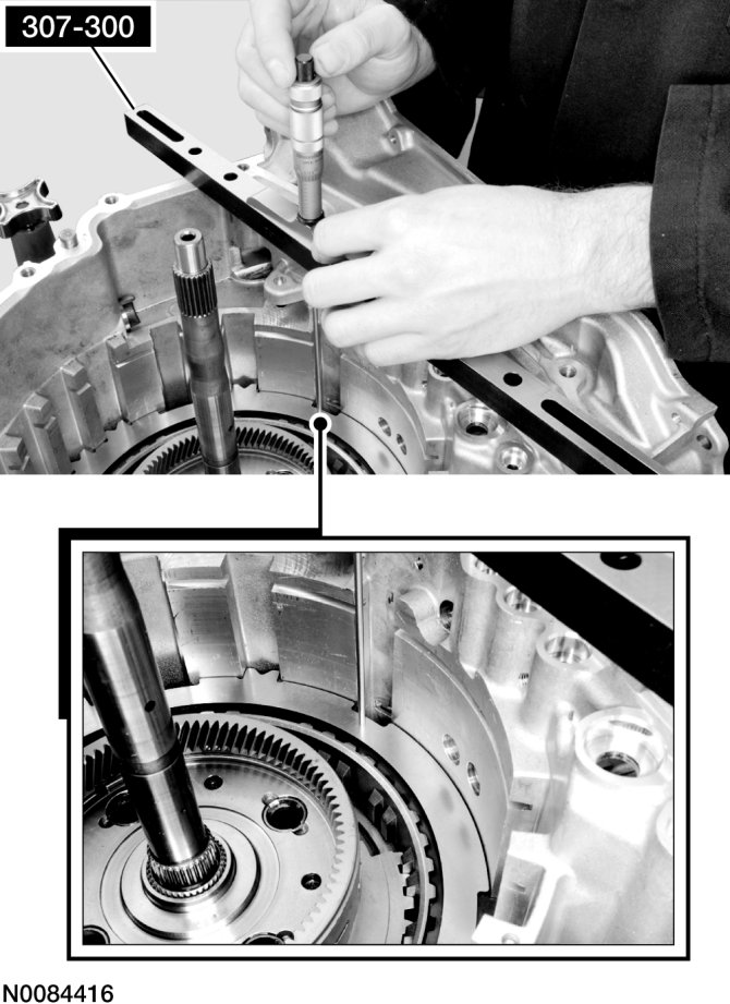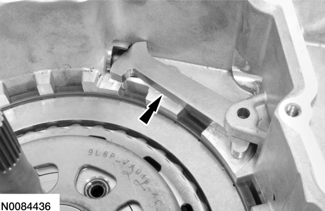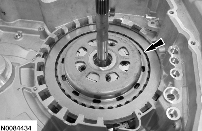 65. Apply 483 kPa (70 psi) of air pressure to the forward (1, 2, 3, 4) clutch piston port while recording the clutch pack clearance on the dial indicator. The clearance should be between 0.076 mm (0.0039 in) and 1.840 mm (0.0724 in). If the clearance is out of range, check the forward (1, 2, 3, 4) clutch pack for correct installation and the transaxle for correct assembly. If the forward (1, 2, 3, 4) clutch pack is correctly installed, install a new forward (1, 2, 3, 4) clutch pack.