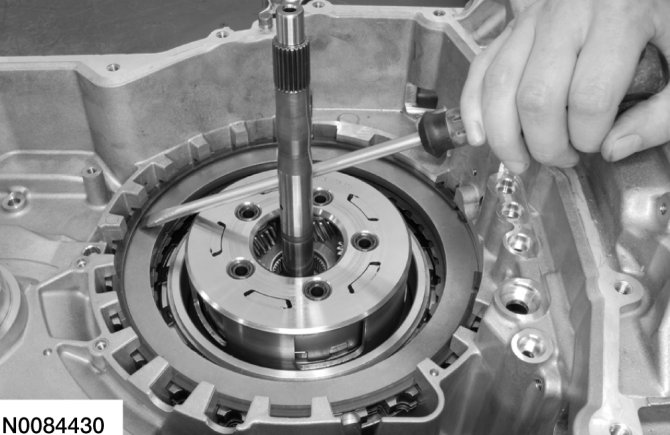 CAUTION:Be sure to install the forward (1, 2, 3, 4) clutch beveled snap ring with the flat side facing down or the snap ring can come loose, causing damage to the transaxle.