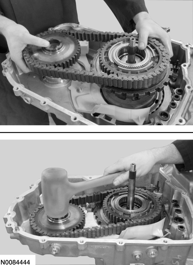 80. Simultaneously install the drive/driven sprocket and chain assembly. Lightly tap on the driven sprocket to be sure it is fully seated in the case.