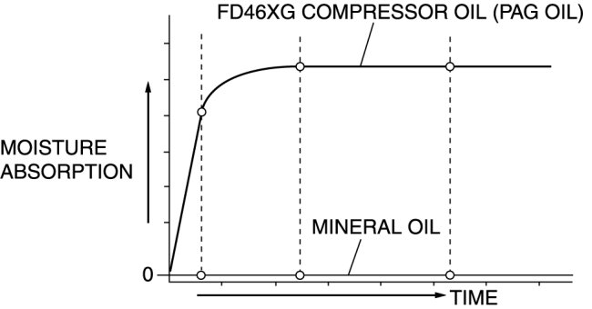 - FD46XG compressor oil (PAG oil) has a higher moisture absorption efficiency than the previously used mineral oil. If moisture mixes with the compressor oil, the refrigerant system could be damaged. Therefore, install caps immediately after using the compressor oil or removing refrigerant system parts to prevent moisture absorption.