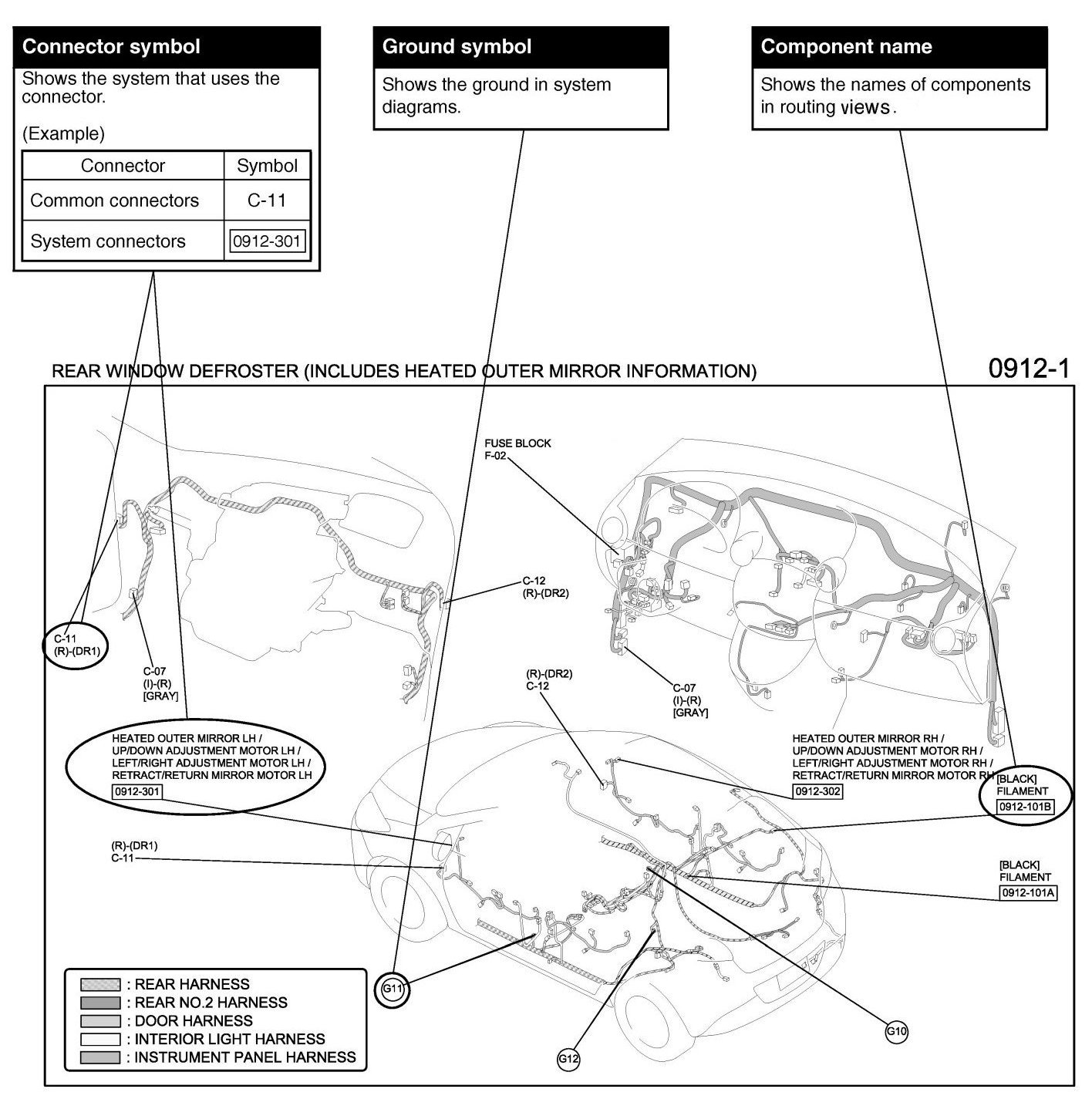 The routing view shows where electrical components are on the system circuit diagram by call out line and connector symbols.