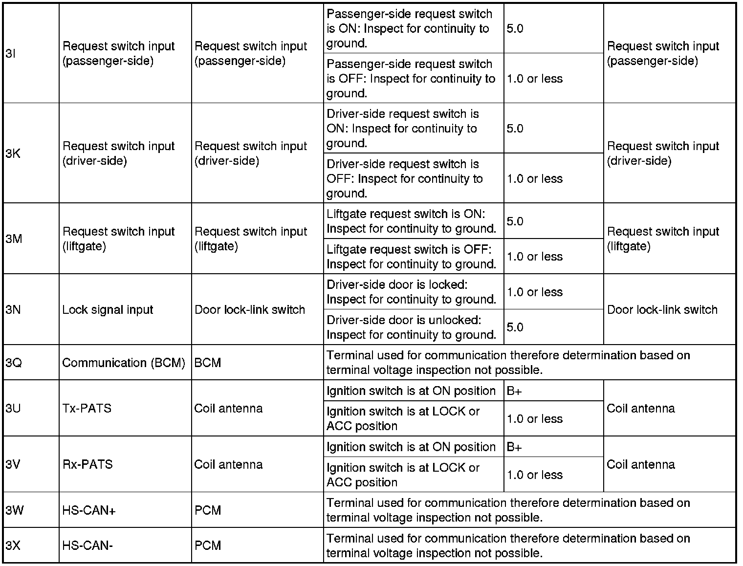 - If the voltage is not as specified in the Terminal Voltage Table (Reference), inspect the parts under "Inspection item(s)" and related wiring harnesses.