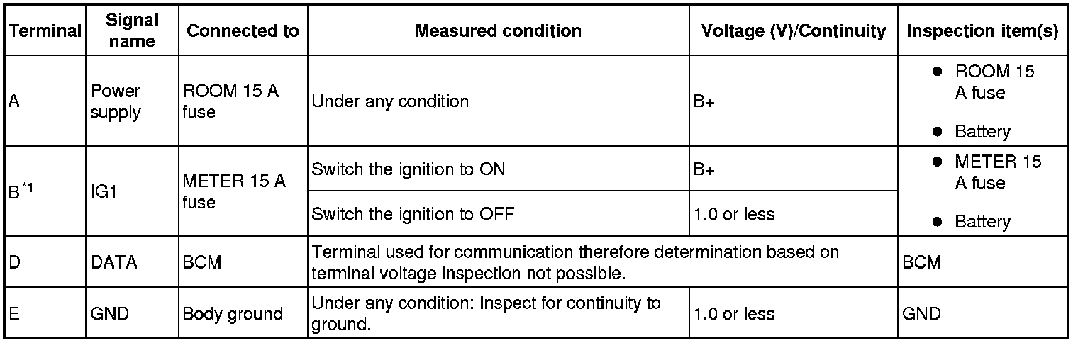 - If the voltage is not as specified in the Terminal Voltage Table (Reference), inspect the parts under "Inspection item(s)" and related wiring harnesses.