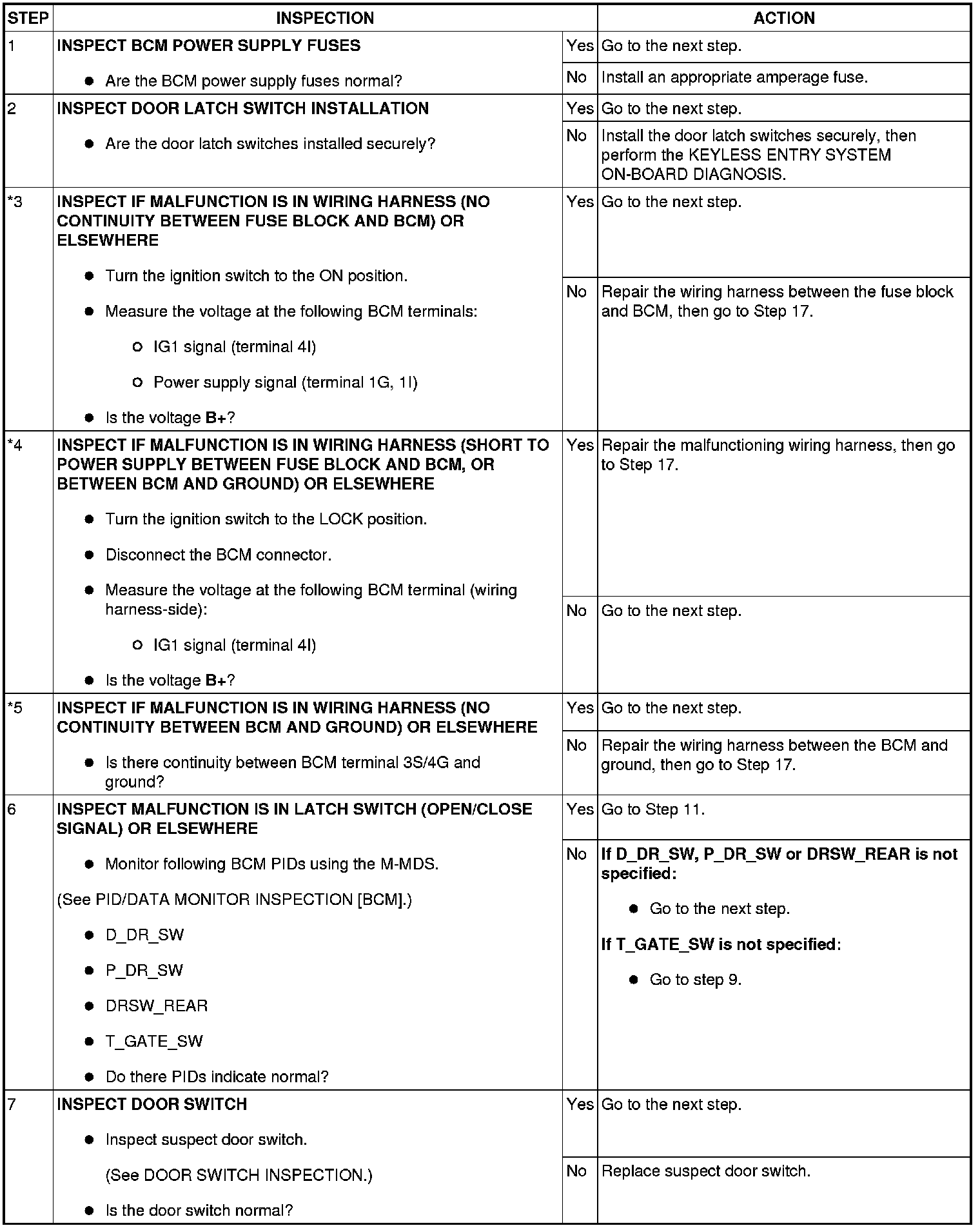 - When performing an asterisked (*) troubleshooting inspection, slightly shake the wiring harness and connectors while performing the inspection to discover whether poor contact points are the cause of any intermittent malfunctions. If there is a problem, verify that the connectors, terminals and wiring harnesses are connected correctly and undamaged.