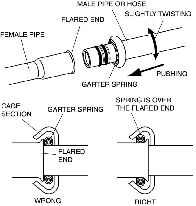 1. Connect the male pipe or hose by pushing it while slightly twisting it onto female pipe until the garter spring at the male pipe or hose is over the flared end of female pipe.
