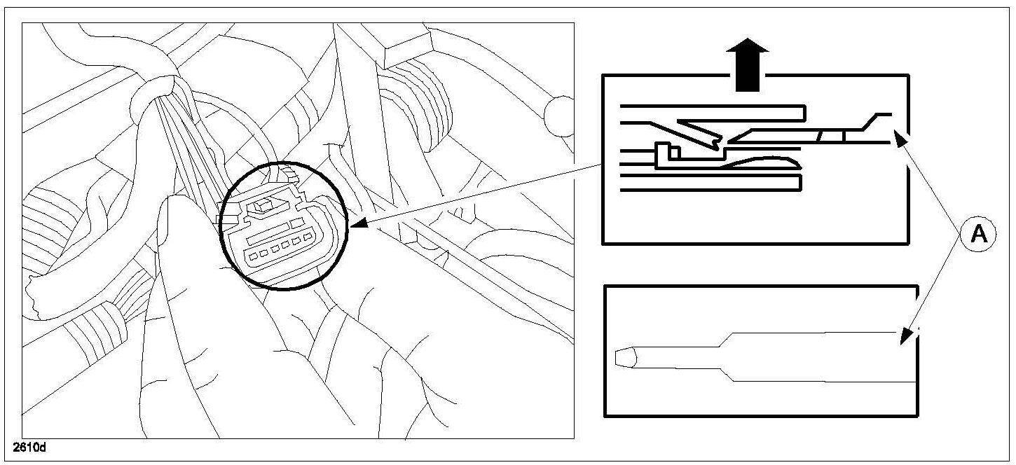 9. Remove all six (6) terminals from the original connector using an appropriate terminal tool (A) as shown.