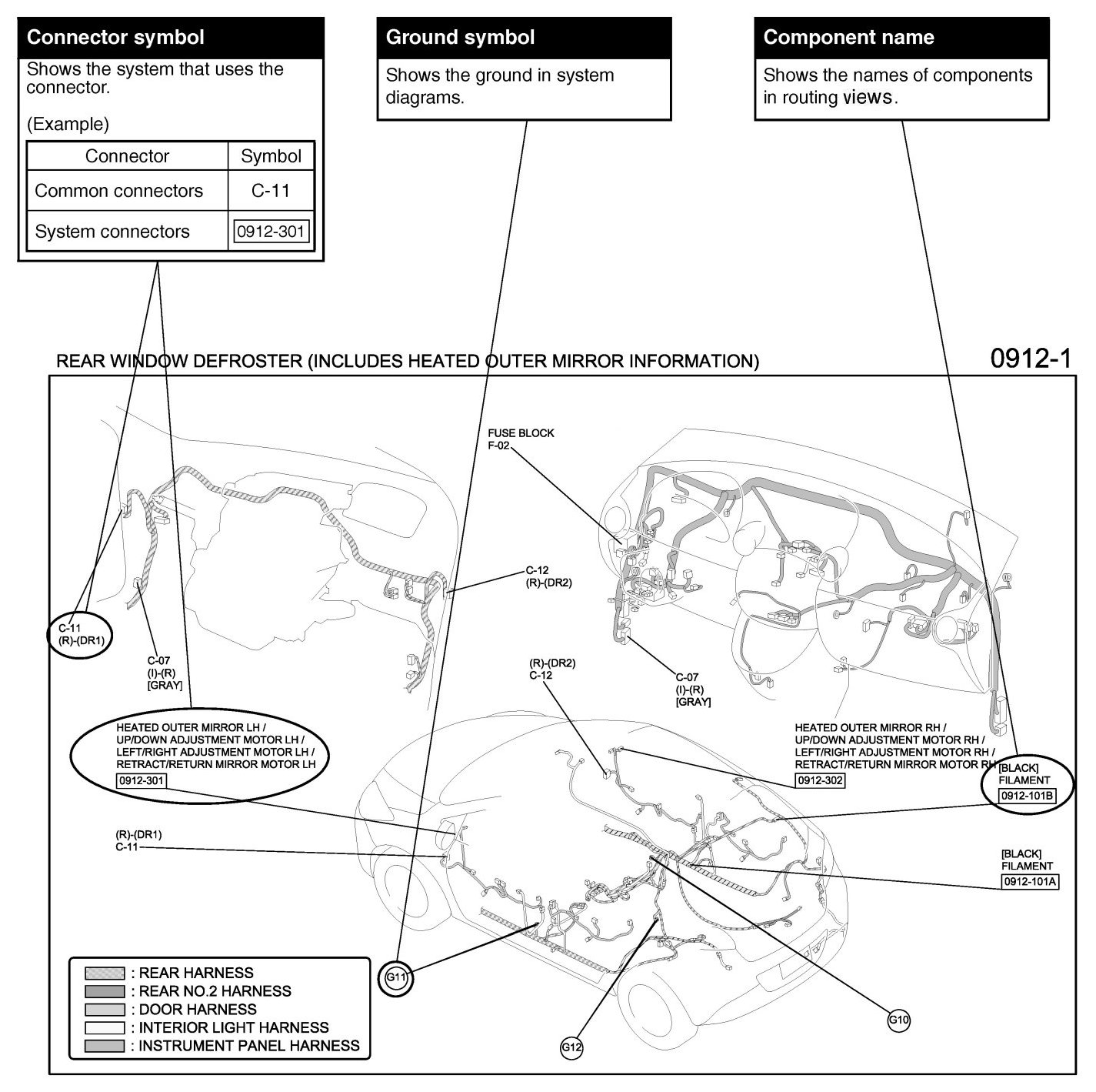 The routing view shows where electrical components are on the system circuit diagram by call out line and connector symbols.