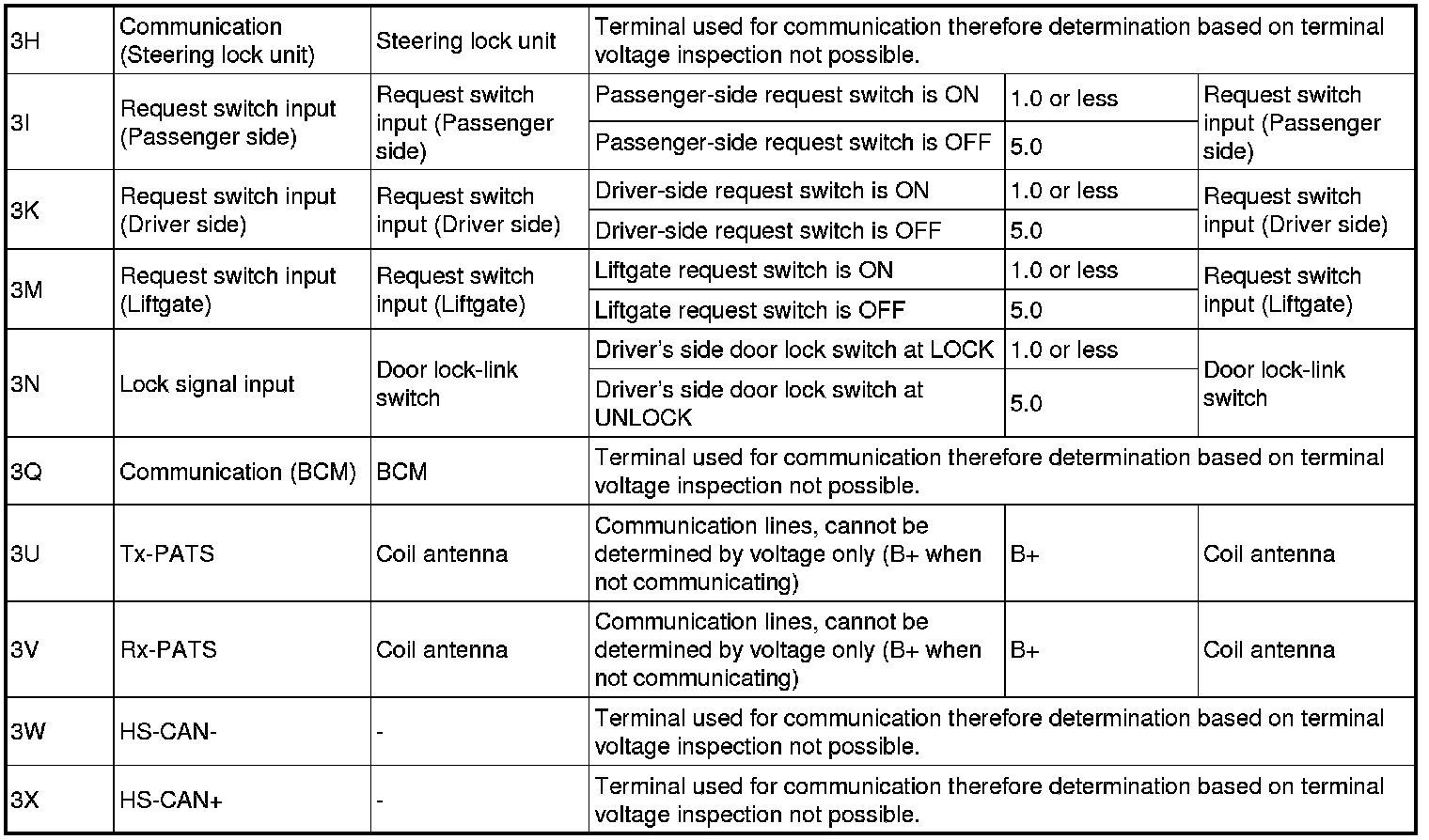 - If the voltage is not as specified in the Terminal Voltage Table (Reference), inspect the parts under "Inspection item(s)" and related wiring harnesses.