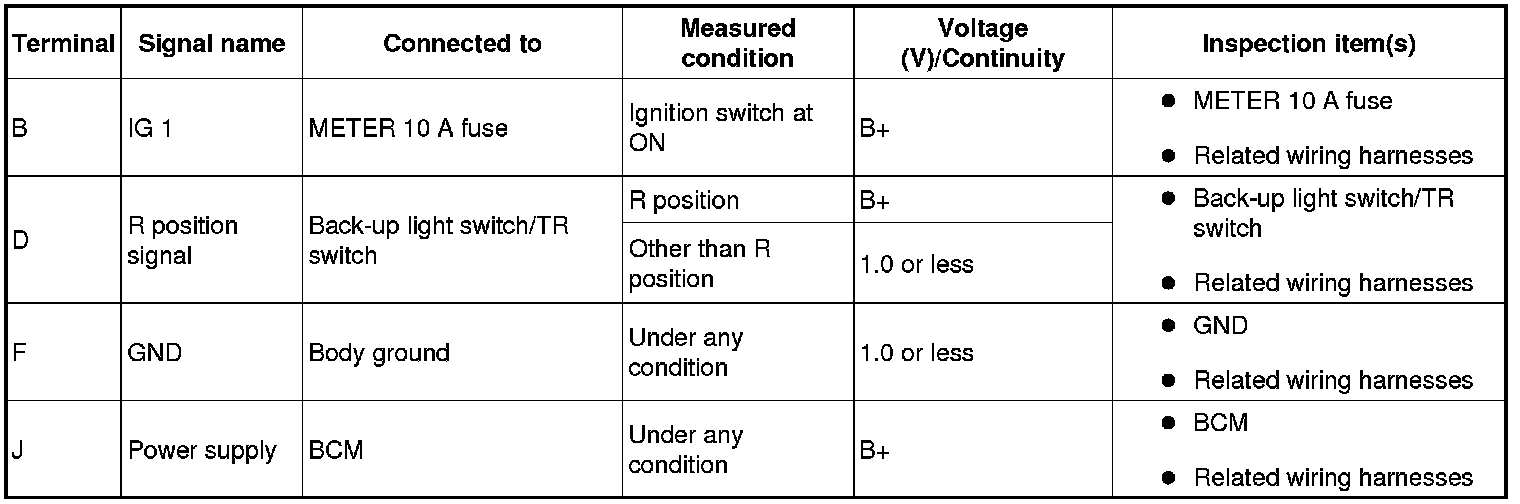 - If the voltage is not as specified in the Terminal Voltage Table (Reference), inspect the parts under "Inspection item (s)" and related wiring harnesses.