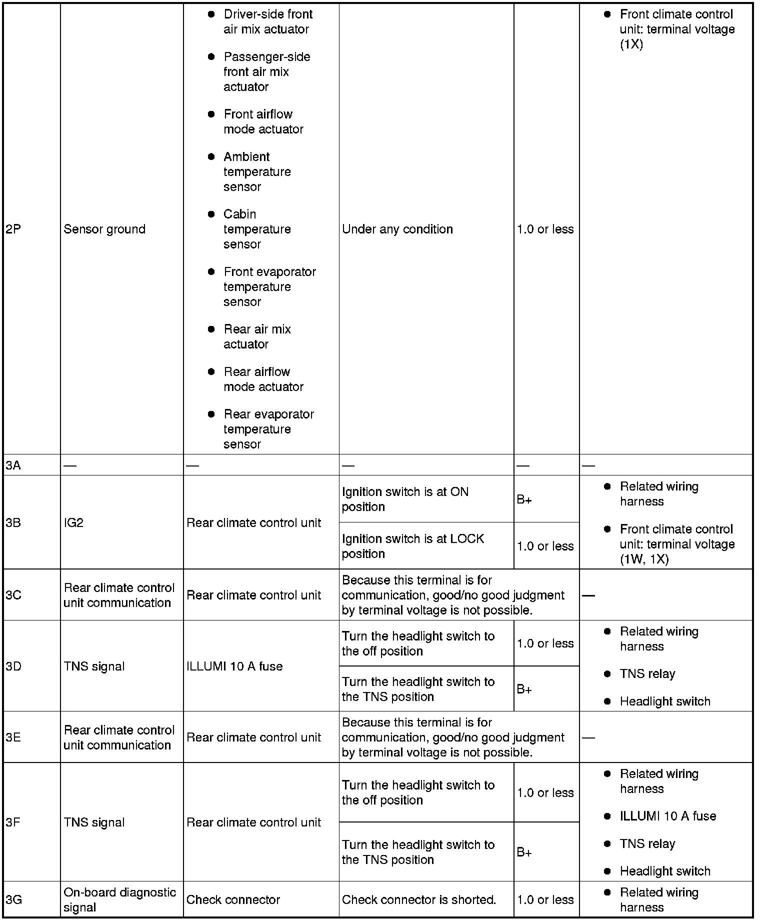 4. By inserting the positive (+) lead of the tester into each front climate control unit terminal, measure the voltage according to the terminal voltage table.