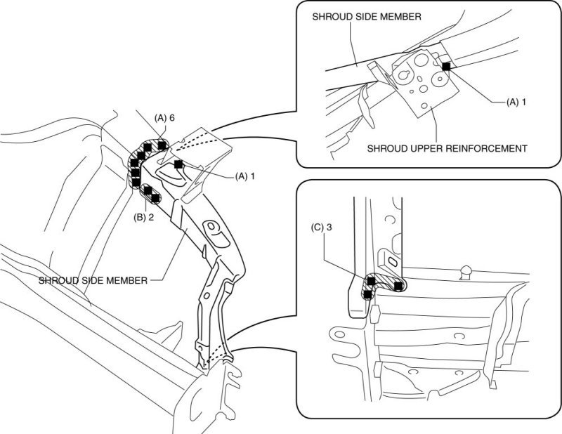 5. Plug weld the 3 locations indicated by (C) shown in the figure, then install the shroud side member.