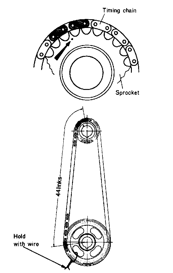 1. Place the timing chain on the crankshaft sprocket and camshaft sprocket with the talley marks and nickel-plated links aligned.