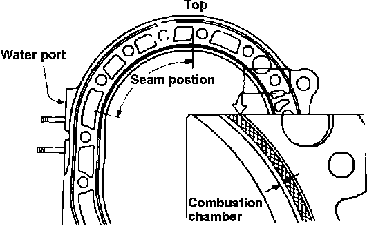 a. On 1984-85 models, the wider line of the inner sealing rubber should face to combustion chamber and the seam of the sealing rubber should be placed at the position as shown in Fig. 37. Do not stretch the sealing rubbers.