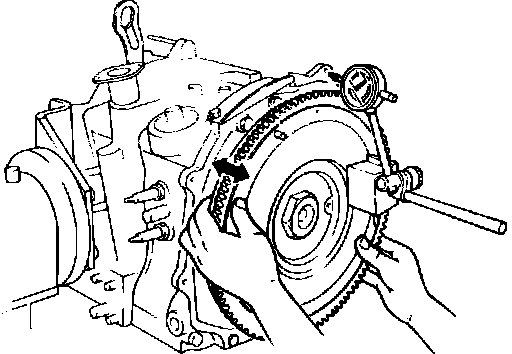15. Move the flywheel fore and aft, and note the reading of the indicator. The standard endplay is 0.0016-0.0028 in. (0.04-0.07 mm).