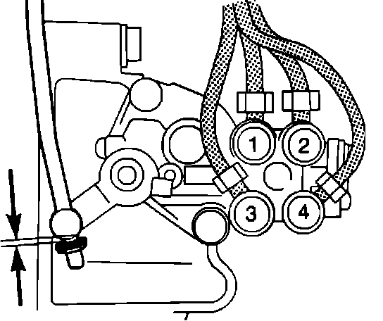 6. When installing metering oil connecting rod on 1986-88 models, check clearance as shown, Fig. 55. If clearance is not .039 inch (1 mm), adjust with shims. On turbocharged models, be sure to connect oil tubes so that colors of tube ends match numbers as shown, Fig. 55: (1), blue; (2), white; (3), green; (4), yellow.