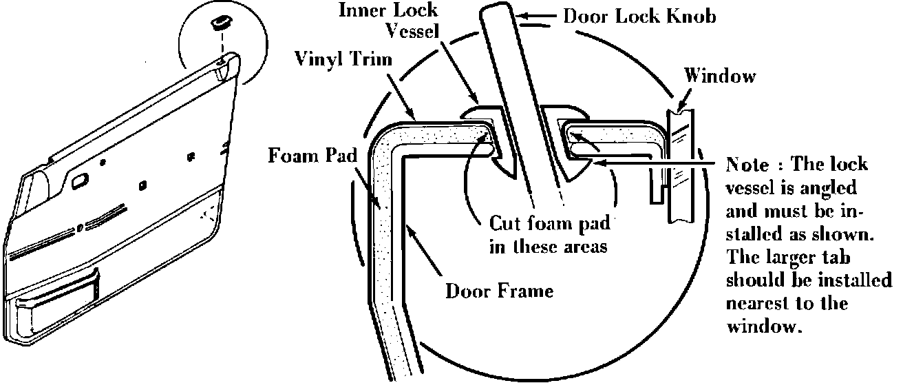 The door trim has been modified to provide more clearance between the inner lock vessel and door lock knob in order to prevent sticking or binding of the door lock knob. There is no change in part number.