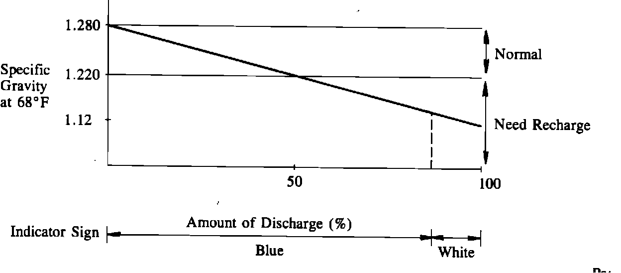 The indicator sign located at the top surface of the battery, does not turn white from blue to indicate the necessity of recharge until the battery is discharged 80% and the specific gravity decreases to 1.150/20~C (68~F).