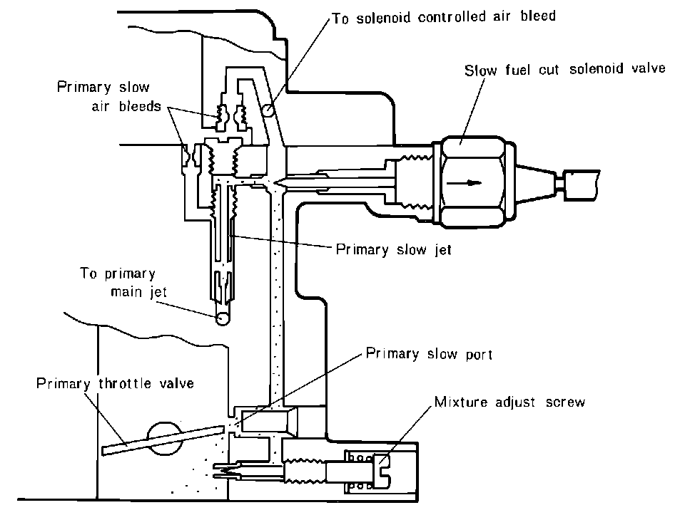 This system, Fig. 5. shuts the primary slow fuel passage to prevent run-on and overheating of the exhaust system when the ignition is turned OFF or during deceleration at engine speeds above a predetermined RPM.