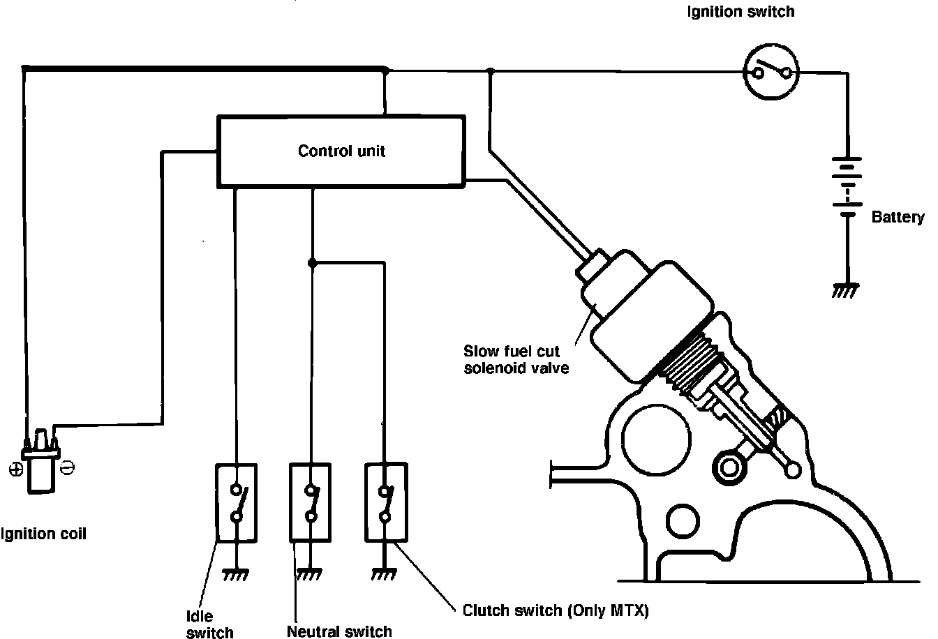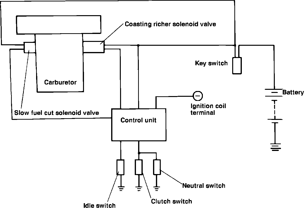 The slow fuel cut solenoid valve is actuated by electric signals (which are controlled by the control unit) from the idle switch, clutch switch and neutral switch, Fig. 9.