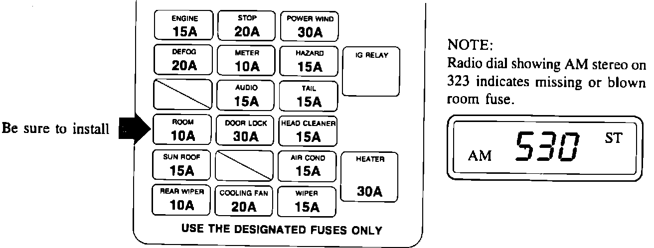 If the "room" fuse on the 1986 323 is blown out or not installed, more than just the interior lights and buzzers may be affected.. Although the radio may light up, there may be distorted sound or no sound at all. Also the "ST" stereo indicator may light up even when the AM band is engaged. However, AM stereo is only available on the 1986 RX-7.