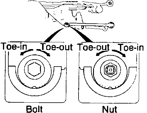 2. To decrease the toe-in turn adjusting cam clockwise for the right arm or counterclockwise for the left arm.