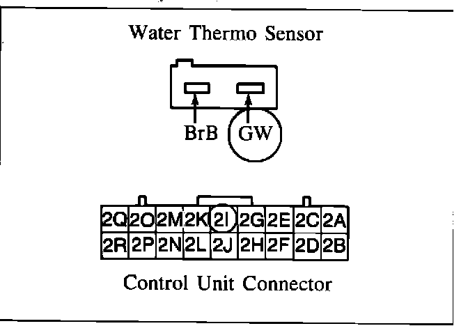b. Check for continuity between the GW terminal of the water thermo sensor connector and the 21 terminal of the control unit connector. Repair the wire harness if the resistance is open circuit.