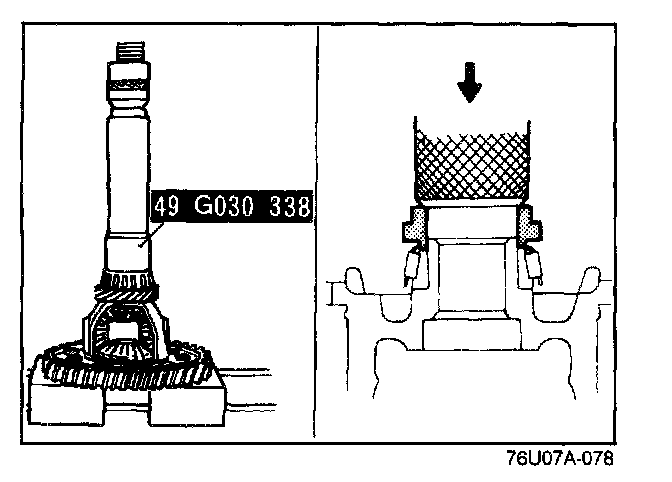 2. Support the ring gear, and press in the side gear inner race using attachment D (49 G030 338) of the bearing installer.