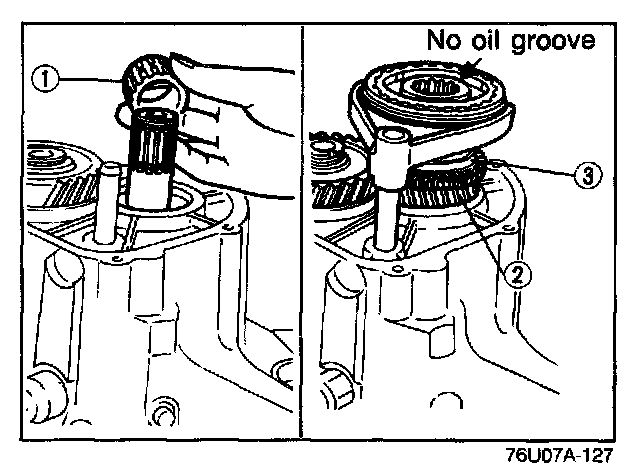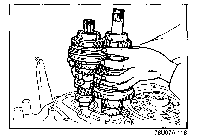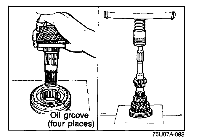 2. Shift the clutch hub sleeve (secondary shaft gear) to 2nd gear and the clutch hub sleeve (primary shaft gear) to 4th gear.