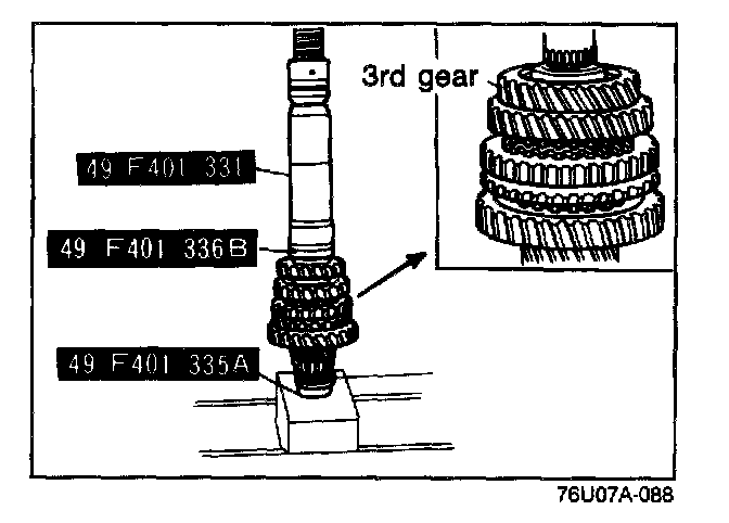 10. Press 3rd gear onto the shaft gear using the body (49 F401 331) and attachment 6(49 F401 336B) of the bearing installer.