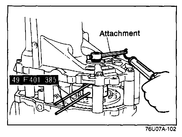 1. After supporting 2nd gear, press on the bearing outer race (engine side) using the body (49 F401 331) and attachment A (49 F401 335A) of the bearing installer.