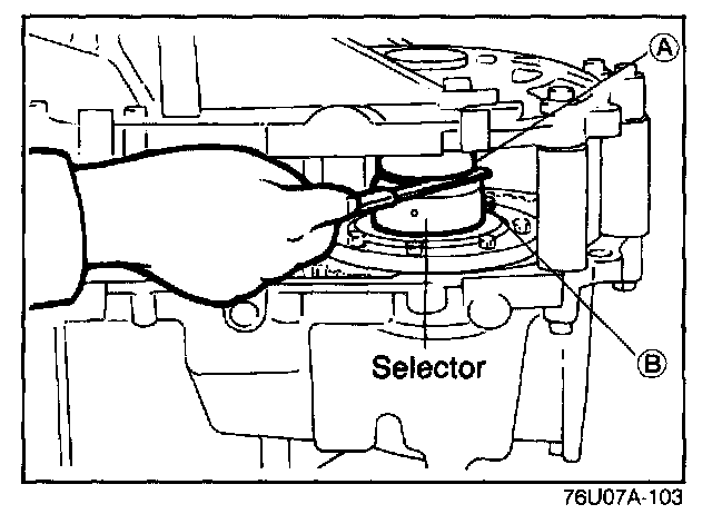 10. To seat the bearings, mount the bars (49 F401 385) on parts (A) and (B) of the selector, and turn the selector so the gap shown by the arrow in the image is widened.