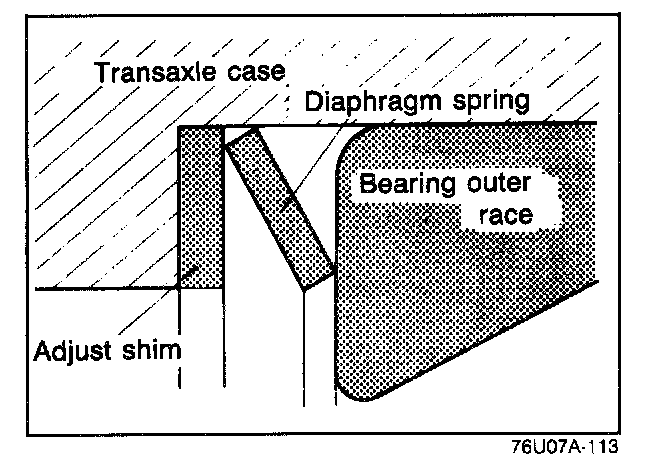 8. Install the previously selected adjustment shim of the primary shaft gear side into the primary shaft gear bearing bore of the transaxle case, install the diaphragm spring in the direction shown in the image, and install the bearing outer race.