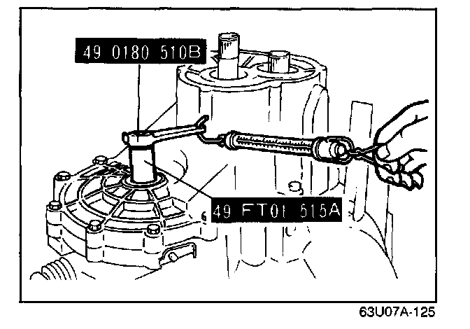 16. Hook a spring scale on the preload attachment (49 0180 510B), and pull the scale to turn the attachment. Adjust the selector with the bars (49 F401 385) until the preload specification is obtained.